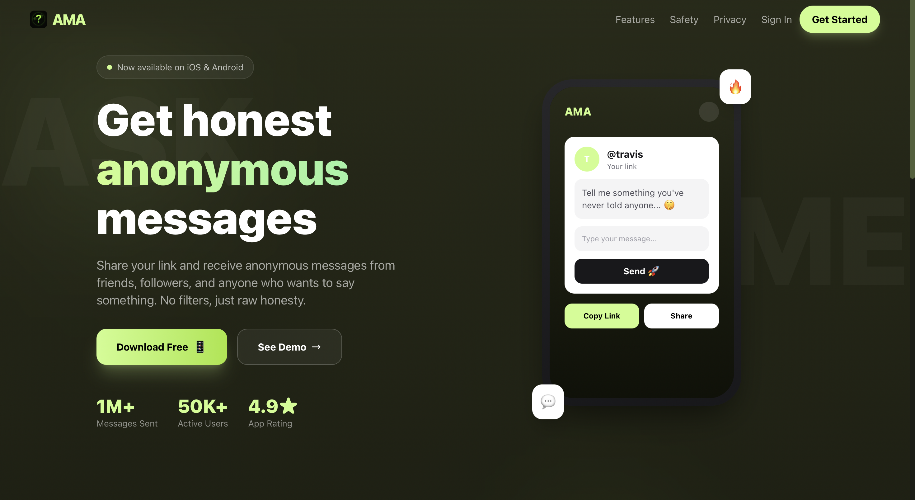Ask Me Anon is an anonymous messaging platform that lets people send you questions or messages without revealing their identity. 1M+ messages sent. 50K+ active users. 4.9★ rating.